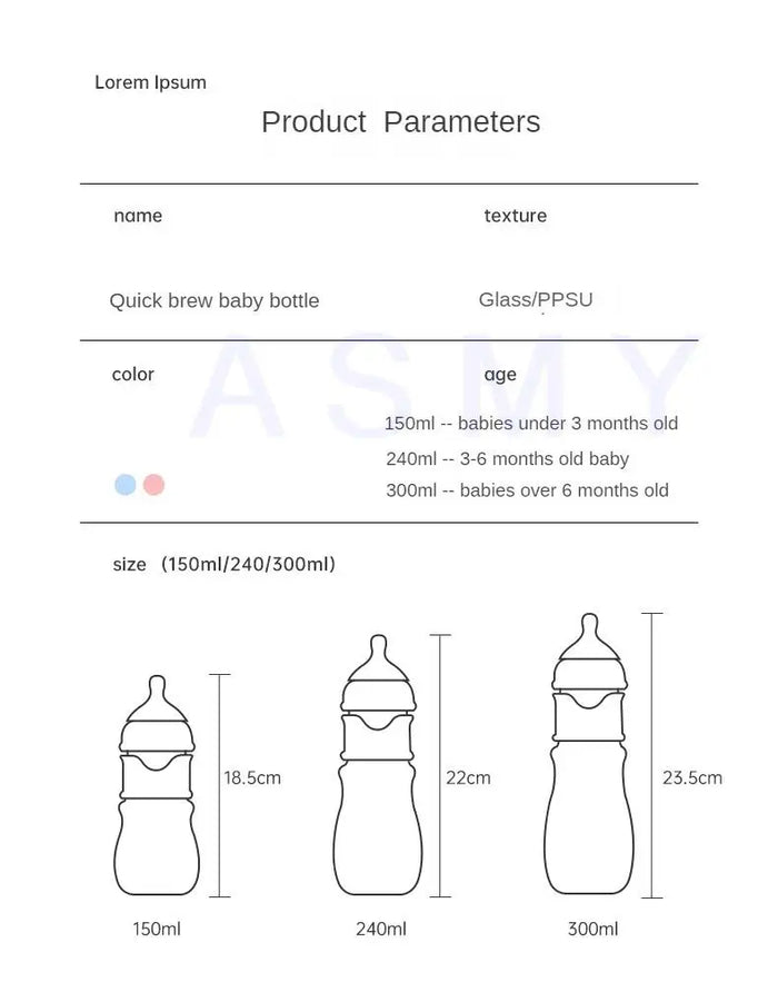 150mL Vem com bico com furo em S, para bebês de 0 a 3 meses 240 mL Vem com bico com furo M, para bebês de 3 a 6 meses |