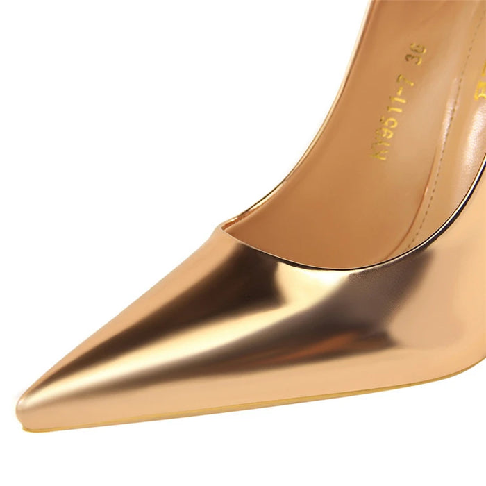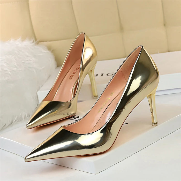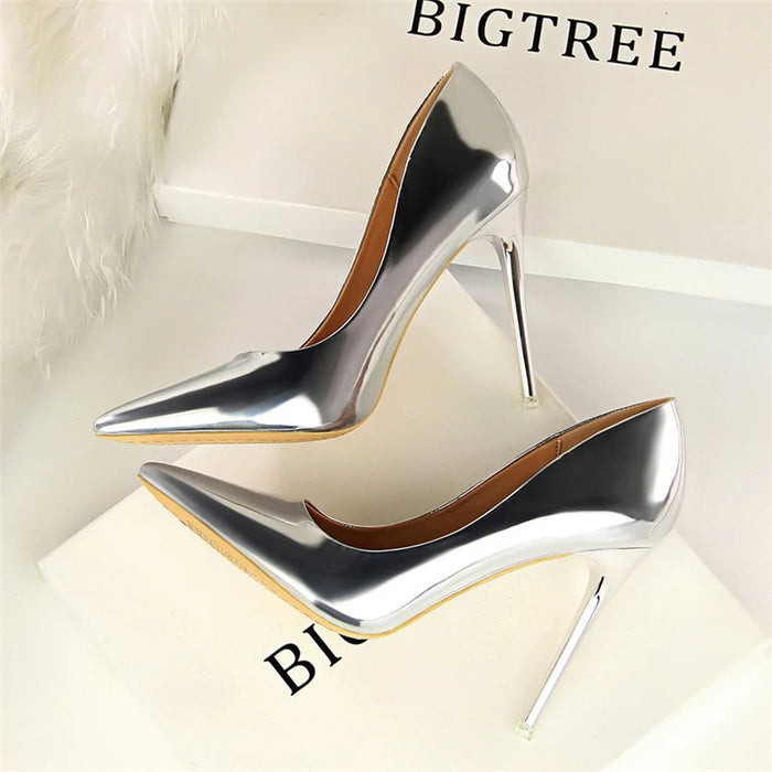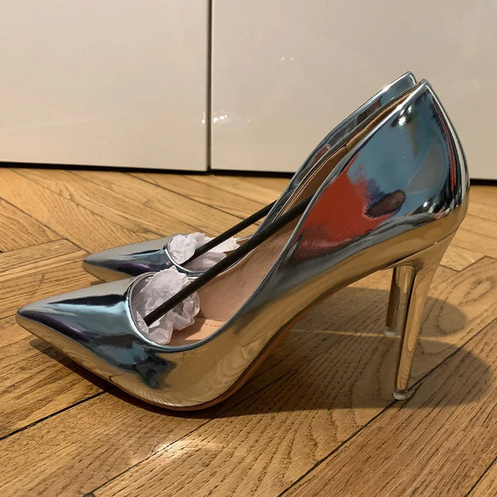 Sapatos femininos de couro envernizado, salto alto de 7,5 cm e 10,5 cm, salto baixo, para casamento, noiva, prateado, dourado brilhante.